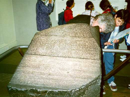 á honum eru á þremur tungumálum, sem gerðu kleift að ráða í hýróglífsku